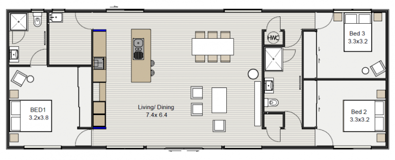Our Legacy120X mono-pitch design with side boxed ends has a spacious master bedroom with en-suite bathroom, 2 large bedrooms with shared bathroom and a separate laundry. Entertain in your generous open kitchen and living area with sliders allowing great indoor/ outdoor flow between your living areas and outdoor space.