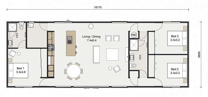 This package also includes allowances for Building Consent, Geotech & Stormwater reports, 22m2 of timber decking, rear landing, steps & handrails, baseboards and delivery onto standard timber piles. Additional allowances have also been made for water, sewerage and electric connections. We’ve also included a heat pump and chosen upgrades for the cladding, flooring and roofing.