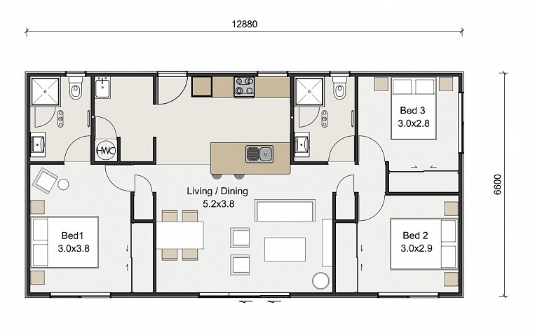 This package also includes allowances for Building Consent, Geotech & Stormwater reports, 14m2 of timber decking, rear landing, steps & handrails, baseboards and delivery onto standard timber piles. Additional allowances have also been made for water, sewerage and electric connections. We’ve also included a heat pump and chosen upgrades for the cladding and roofing.