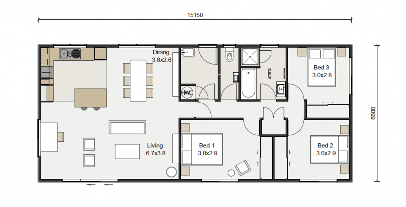 Keith Hay Homes are offering their versatile Legacy 100 plan which is an excellent starter home, rental or for retiree’s wanting to downsize. This plan offers three double bedrooms, open plan kitchen/living/dining room, bathroom with separate toilet and separate laundry room. There are options to customise the plan and add an en-suite, front door, roof shape, kitchen design as well as cladding options.