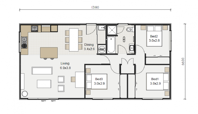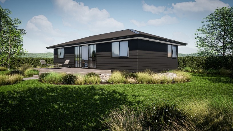 Keith Hay Homes are offering their versatile Legacy 87 plan which is an excellent starter home, rental or for retiree’s wanting to downsize. This plan offers three double bedrooms, open plan kitchen/living/dining room, bathroom and laundry area. There are options to customise the plan and add an en-suite, front door, roof shape as well as cladding options.