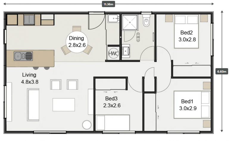 3 Bedrooms and 1 bathroom, 75m2 floor area.