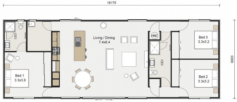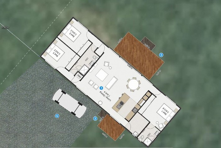 The ‘Legacy 120X’ house plan shown here is a stylish and modern design with three double sized bedrooms, two bathrooms and an open plan kitchen, dining, and lounge area. With large ranch sliders on both sides of the living area, bask in the beauty of the light and nature around you whilst relaxing in the warmth and comfort of your lounge. The main ranch sliders open up to a large deck area facing the majestic Mt Ruapehu making this home the ideal haven for you to unwind and slow down.