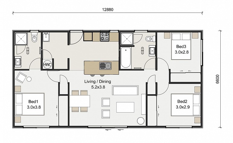 This turnkey house & land package from Keith Hay Homes includes allowances for a site building consent and drawing plans (includes site reports) PLUS of course delivery of your new transportable home to the site and standard timber piles, a 15m2 deck, steps, handrails, and baseboards all fitted on site. An allowance has also been made for a 25,000L Bailey water tank, high pressure water pump, a septic tank, site electrical work, drainage, plumbing and stormwater connections all done ready to move in.