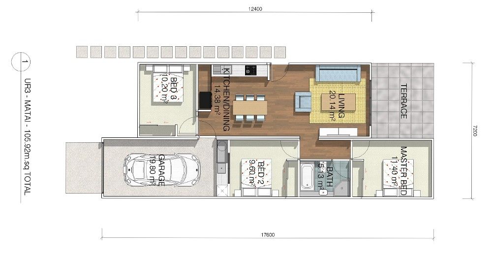 A modern 3 bedroom home designed to fit a compact section, with open plan living and a large master bedroom.