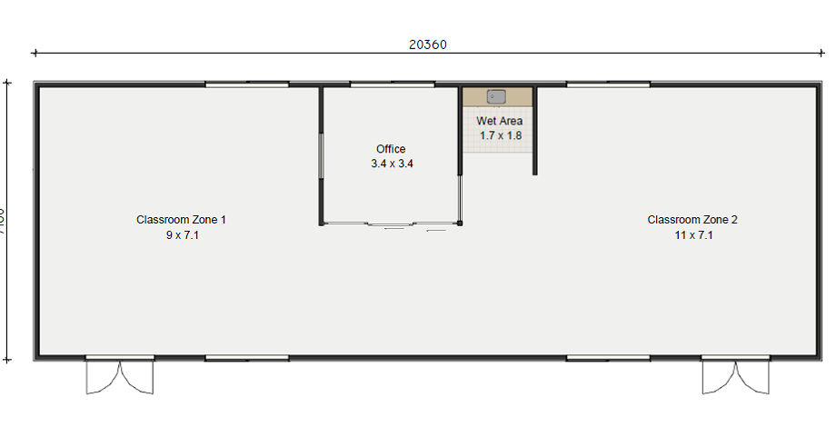 The 148m2 double design features a flat acoustic tile suspended ceiling with sufficient lighting and plenty of windows and doors for ventilation. Complete with a closed in office space or break out room, wet area with sink and a storage cupboard at each end of the building, the options are endless. Transform your educational space with the da Vinci classroom plan.